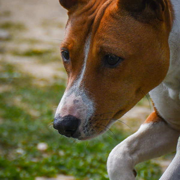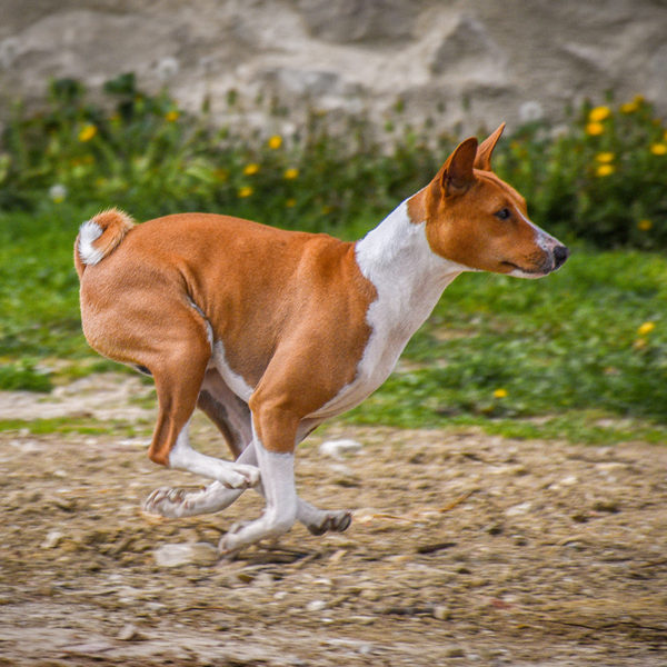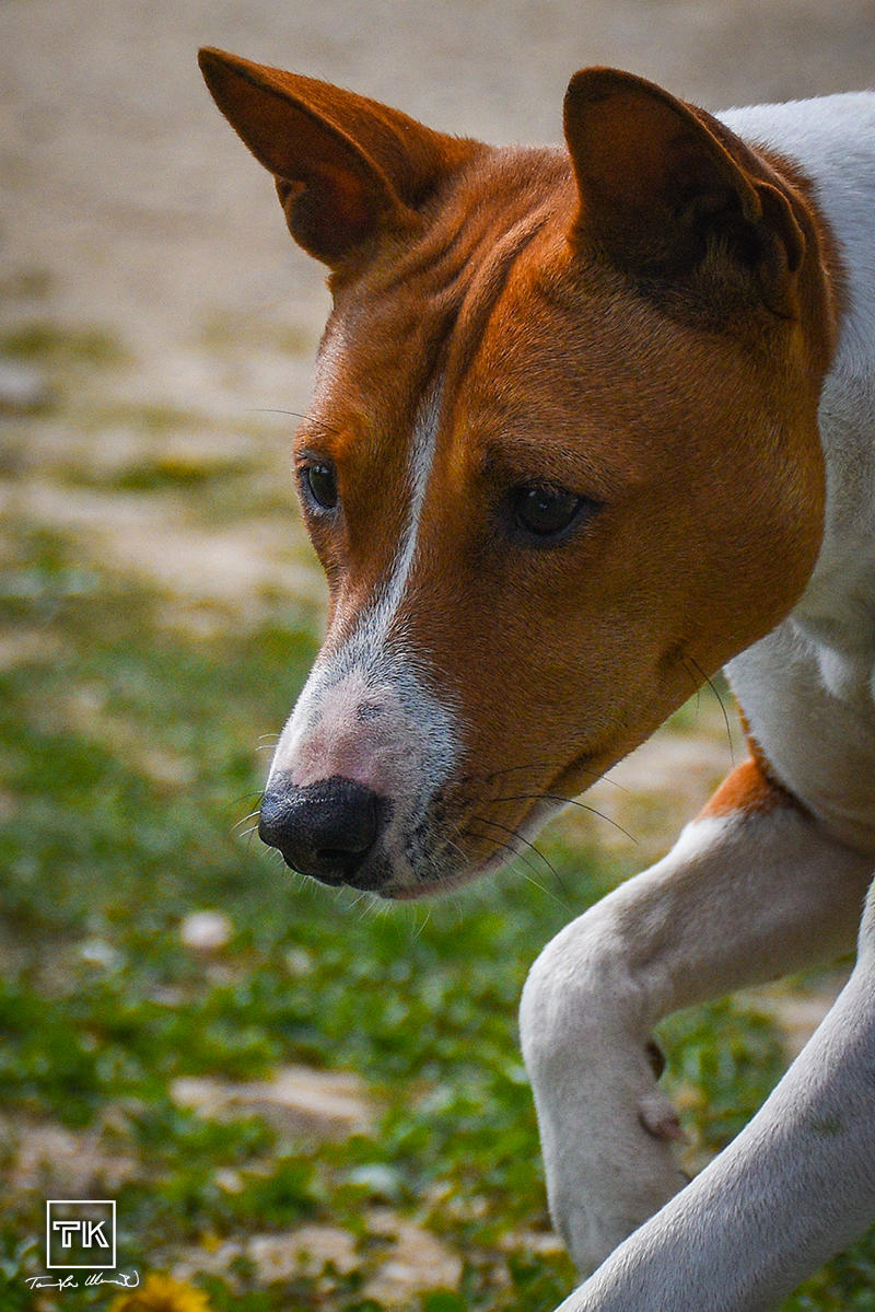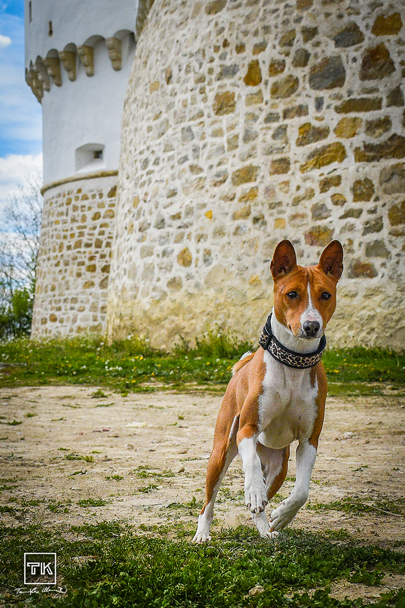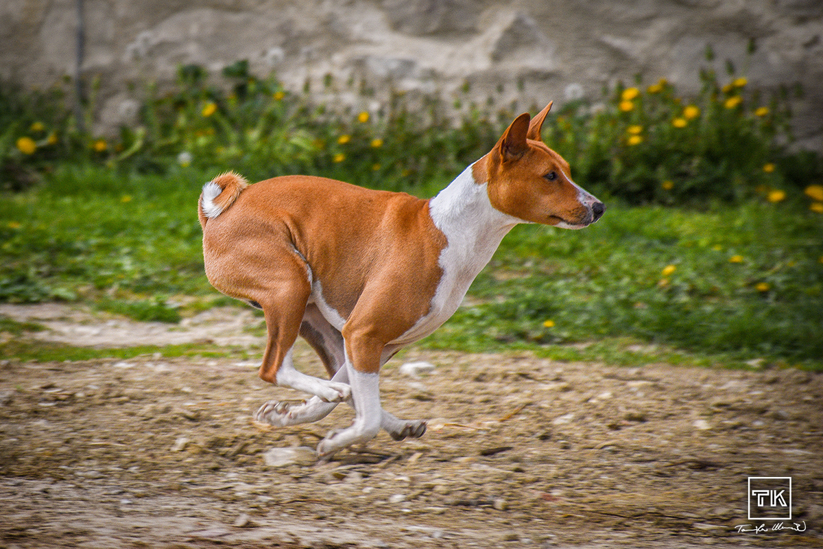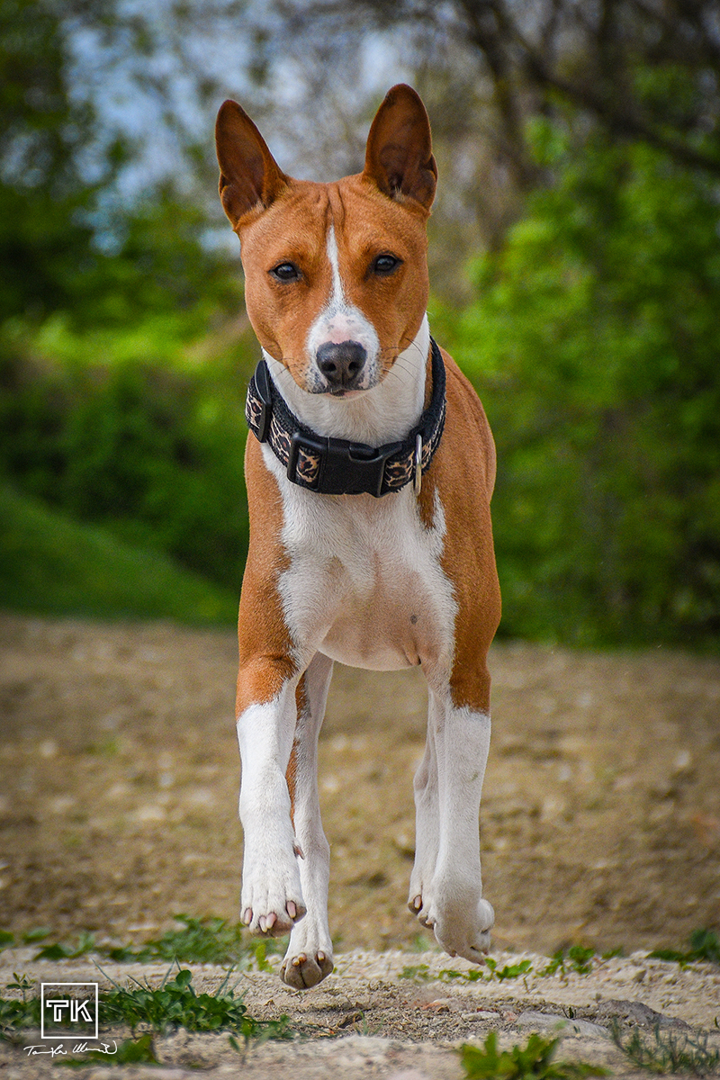 Thor is extremely fond of people and particularly children. He loves cuddling with them. This is probably in big part due to spending his first months in the company of two young boys, sons of Liv and Dag, owners of the esteemed Norwegian kennel Kingwanas. Liv and Dag put a lot of effort in producing not only top pedigree basenji, but also an excellent family member. Thor is very attached to my husband who almost daily roam with him in the wild. He is extremely intelligent. It seems he understands all we tell him and he shows great creativity when chasing animals in the wild. His intelligence was visible from the very beginning. That is why he got his kennel name Kingwanas Quizmaster. Some of his offsprings ended up in agility training.