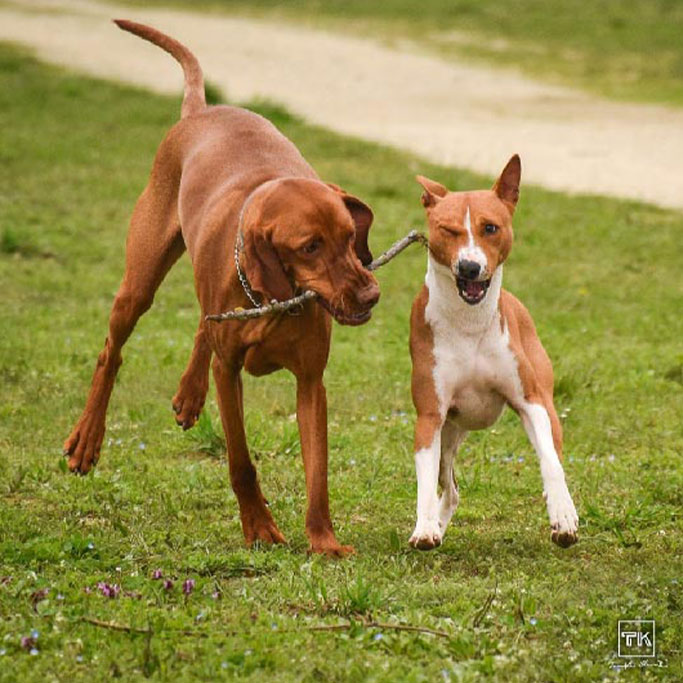 This breed is also very playful with other dogs. They love to play and chase with each other. Of course, the other dogs chase them because of their speed. Basenji is also breed which doesn’t have fear of bigger dogs, horses or other big animals. They are curious breed and only think about playing with these animals. When they are not puppy anymore, some of them can be territorial, protective and competitive. Dominant male or female could fight each other (male to male and female to female).